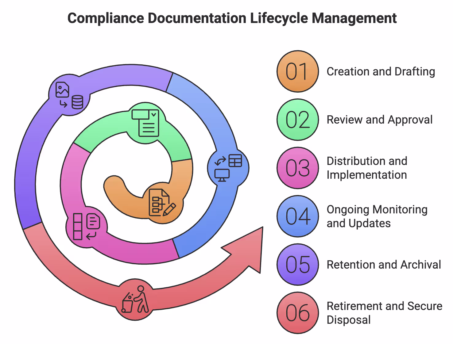 Compliance documentation isn’t static. It evolves, changes, and eventually expires. Without lifecycle discipline, even strong policies become risky. CDLM ensures documents stay controlled, current, and defensible from creation to disposal. This lifecycle documentation approach keeps every compliance artifact traceable from drafting and approval through archival and secure disposal.